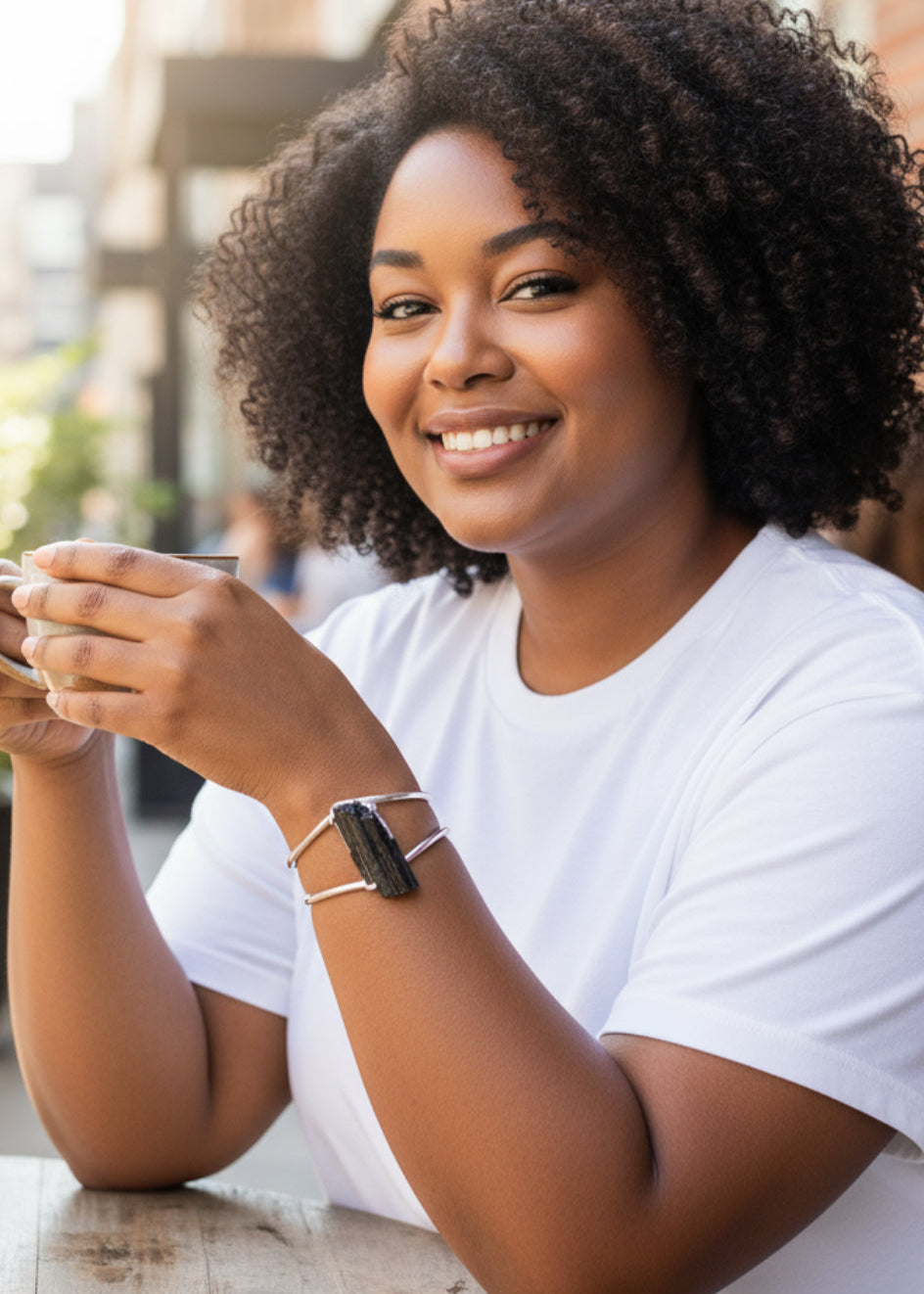 Elevate your style with this sleek black tourmaline cuff, designed to offer both elegance and protection. Known for its powerful energy, black tourmaline wards off negative influences and shields the wearer from harm. Perfect for those who seek a sophisticated, boho-inspired touch with meaningful energy support.